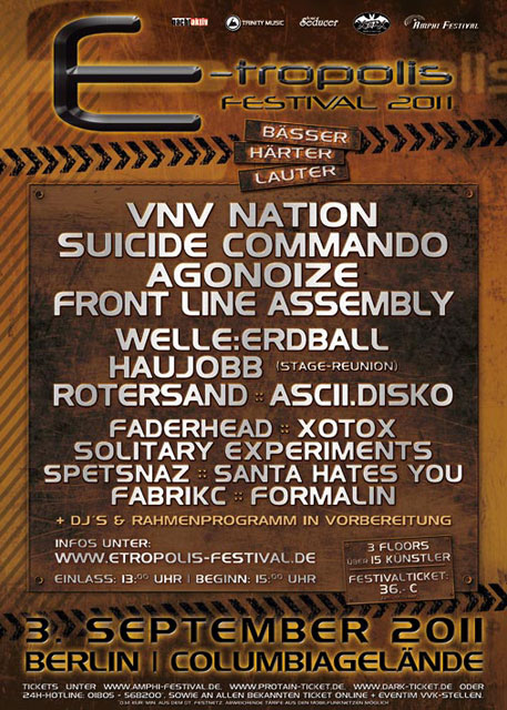 E-Tropolis 2011 FlyerZum zweiten Mal findet in Berlin das E-Tropolis Festival statt. Nach einem fulminanten Start im Jahr 2010 geben sich auch dieses Jahr 15 Bands auf zwei Stages auf dem Columbiagelände die Ehre.