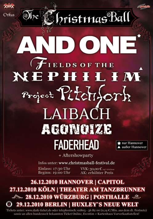 Während im vergangenen Jahr das Capitol mit dem zusätzlichen Act Front 242 das Finale bildete, geht es dort dieses Jahr fulminant los: And One spielen auf der Christmas Ball Tour 2010 exklusiv in Hannover, dafür müssen Besucher des Capitols auf Fields of the Nephilim verzichten, die in Köln, Würzburg und Berlin den Abend headlinen.