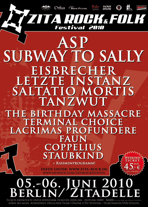 Das vierte Zita Rock Festival – einige von Euch werden es sicherlich schon bemerkt haben – ist um den Zusatz „Folk“ erweitert worden. Am 5. und 6. Juni 2010 erwarten Euch auf zwei Stages auf der Spandauer Zitadelle an der Renaissance-Kulisse am Havelufer insgesamt 12 Band aus dem Gothic-, Mittelalter- und Folkszene. Der Vorverkauf läuft bereits seit September.