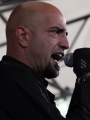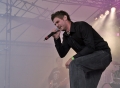 Besagter IMATEM ist ein Soloprojekt von Peter Spilles von Project Pitchfork. Als er anfängt zu spielen sind deutlich weniger Menschen vor der Bühne als gerade eben zu Eisbrecher. Der Auftritt beginnt mit verschiedenen Tonfetzen aus Newsmeldungen, die bald mit sporadisch auftauchendem Synthgedudel untersetzt werden, das hintergründig, aber deutlich, Akzente setzt. Man könnte das auch beispielhaft für die Musik von IMATEM nennen, denn die richtigen Songs die nun folgen zeichnen sich vor allem durch gut tanzbare Rhythmen und akzentsetzende Synthbegleitungen aus. Imatem verwendet als erster Künstler eine Videoprojektion, um die Show ein wenig aufzupeppen, wenn auch nur mit sehr beruhigend wirkenden, langsamen Animationen hinter dem Bandlogo. Ich fand es ein wenig enttäuschend, dass der gute Mann nicht einmal so tut als würde er das Instrument live spielen. Die Musik varriierte fröhlich weiter, auch nachdem er selbst einfach mal über die Bühne spazieren gegangen ist. Dafür bereicherte er sein Repertoire durch diverse Gastsänger. Ein erstes Highlight bildete hier das Duett mit Falk Leng, der seine Texte mit viel Emotion und sehr überzeugend vorsang. Aber das wirkliche Highlight des Aufrittes bildete der Song, in dem der Publikumsliebling des Tages mitsang: