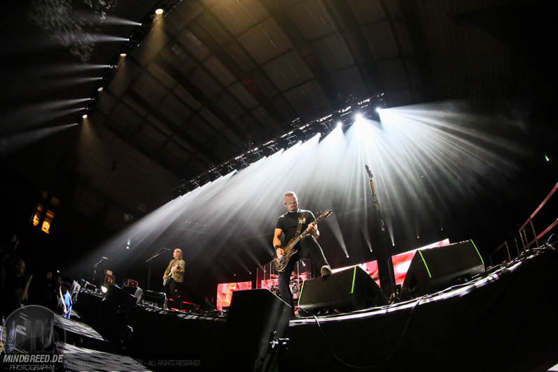 Die Beine taten langsam weh und dann kam endlich Alter Bridge auf die Bühne. Noch ein mal flatterte mir die Hose im Bühnengraben und das obwohl die Band noch technische Probleme mit dem Bass hatte. Dieser wurde dann ab dem zweiten Lied auch aktiviert. Spannend und überwältigend war auch die Lichtshow. Wie ihr auf den Bildern sehen könnt, gab es zwei Reihen von Scheinwerfern. Die in allen Farben leuchteten und teilweise auch einen unangenehmen Stroboskopeffekt erzeugten.