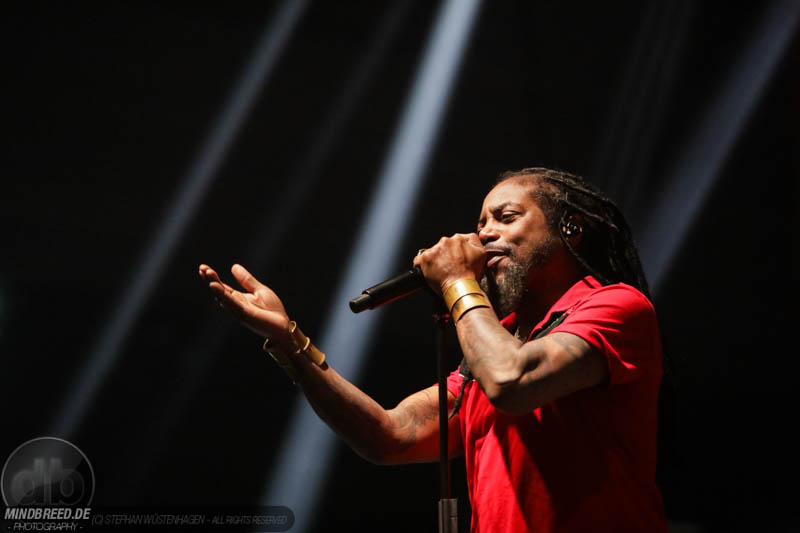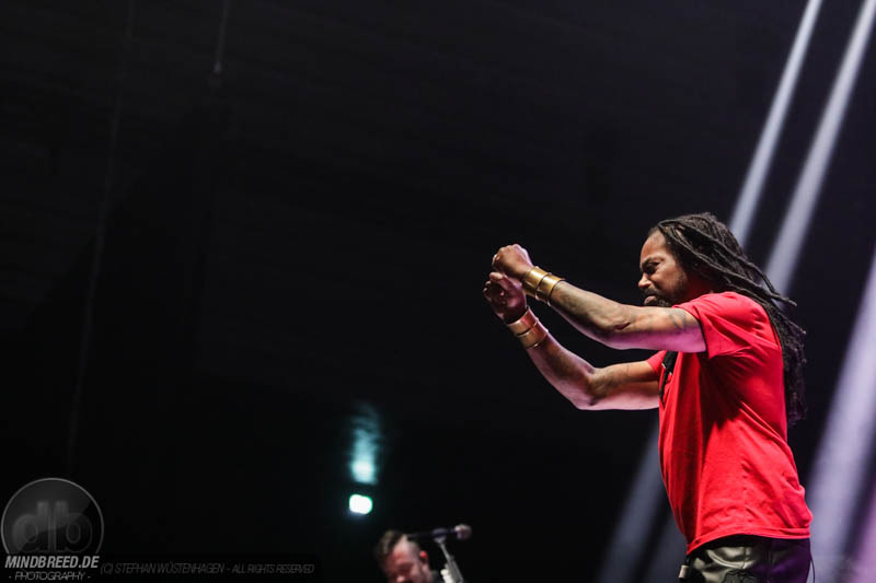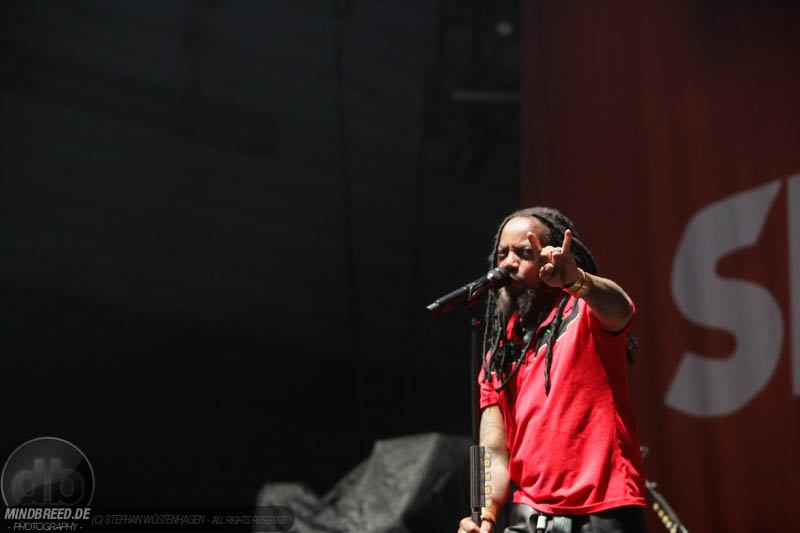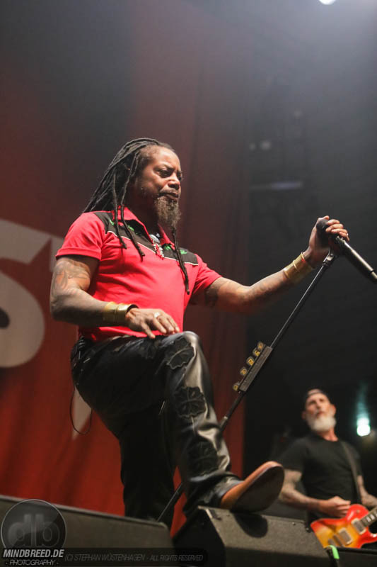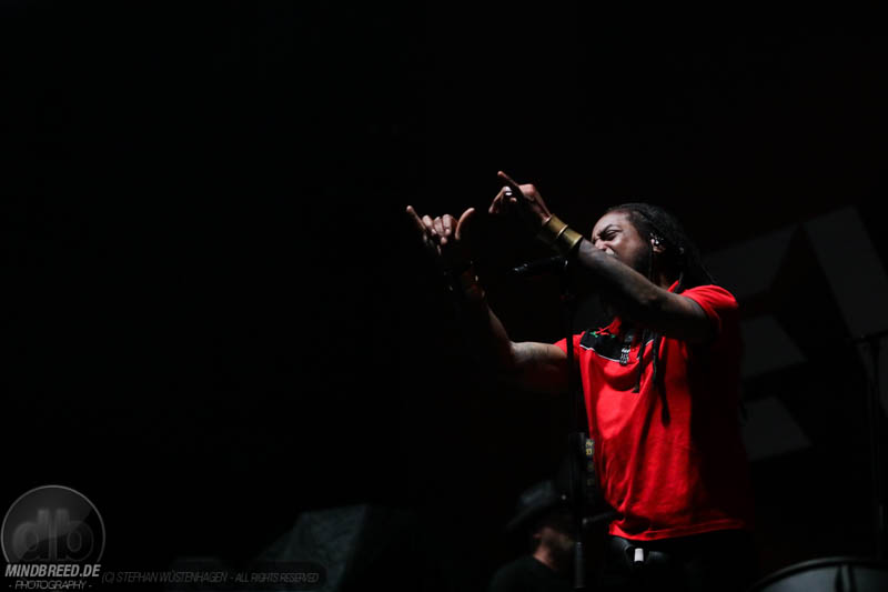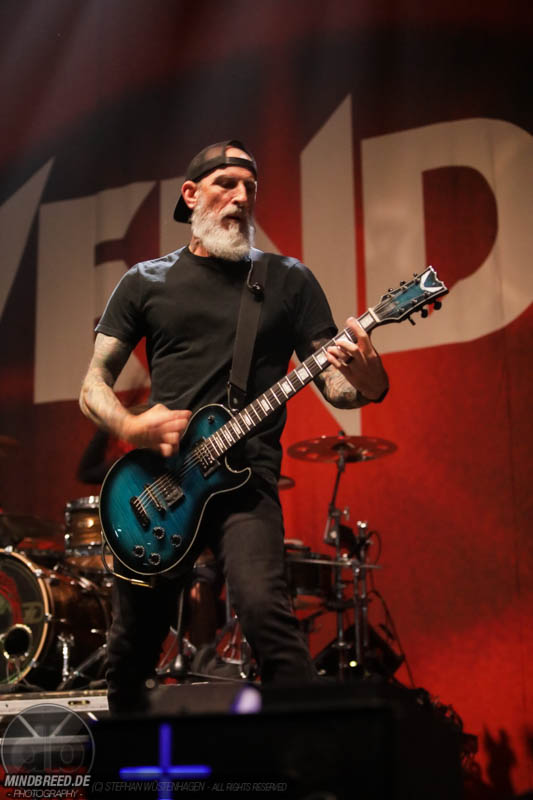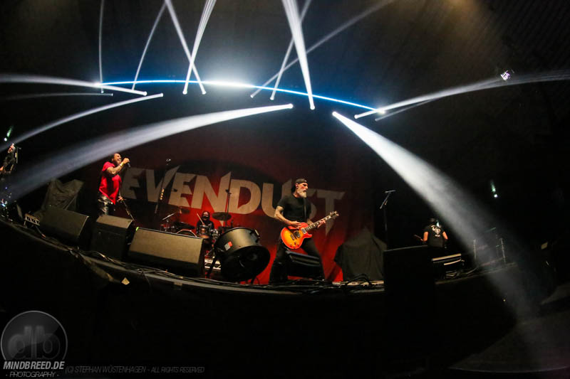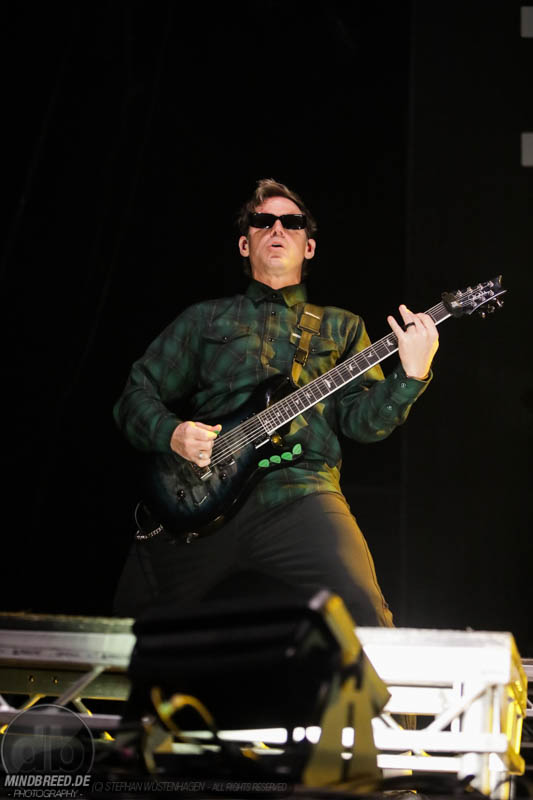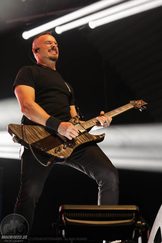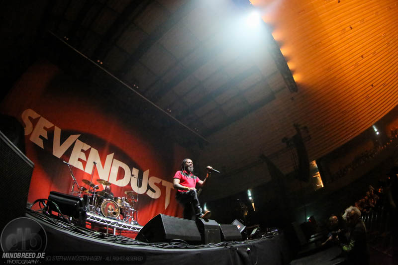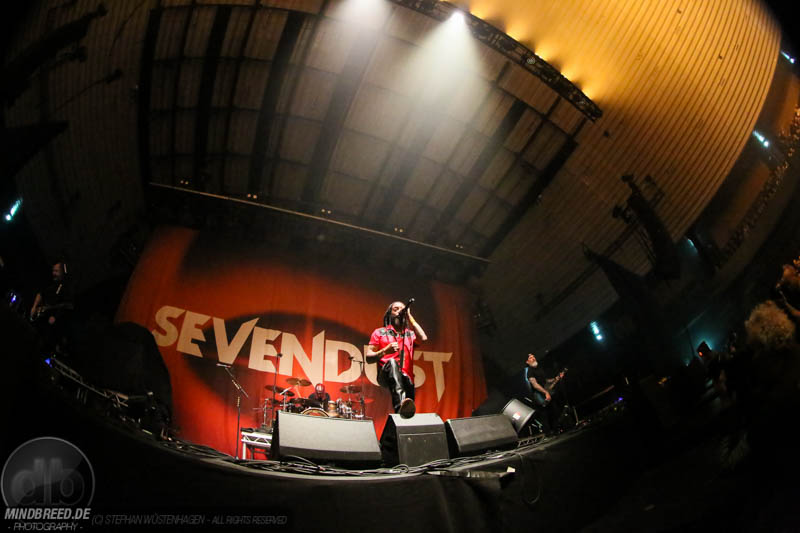 Einlass war 18:00 und Konzertbeginn 19:00. Also erst Klamotten abgeben und an den imposanten Merchandisestand. Den Anfang machten dann pünktlich Sevendust. Für uns Fotografen gab es quasi das halbe Set zu fotografieren, denn sie spielten leider nur sechs Songs. Hier gab es unter anderem Black, Denial und Enemy auf die Ohren. Die Jungs inklusive Sänger Lajon Witherspoon gaben ab den ersten Takten Vollgas und man konnte ihnen wirklich anmerken wieviel Freude sie bei dem Konzert hatten. Interessant fand ich besonders das Lajon mehrfach betonte, dass er nicht politisch werden wollte. Er sagte jedoch dass er schon immer mal grübelte, was so in der Welt passiert und dass man am Ende des Tages jedoch immer weiß was richtig oder verkehrt ist.