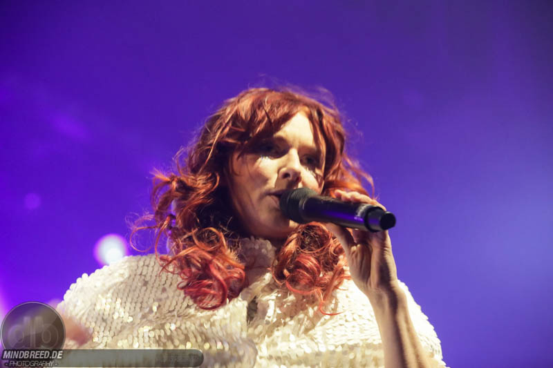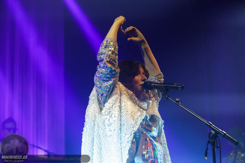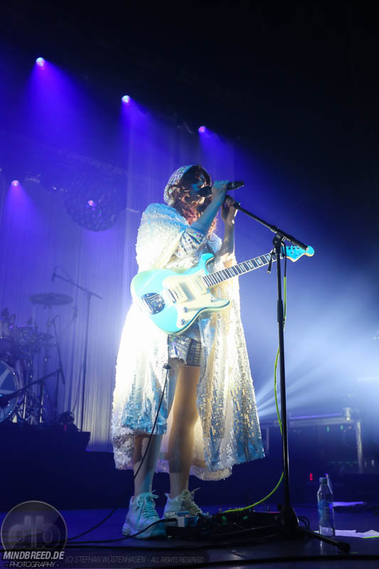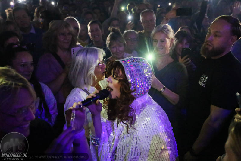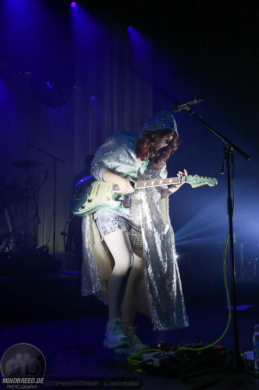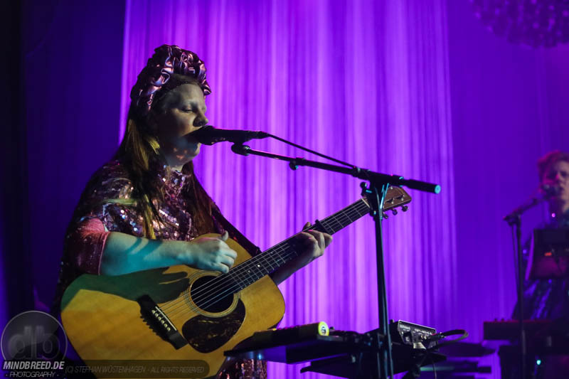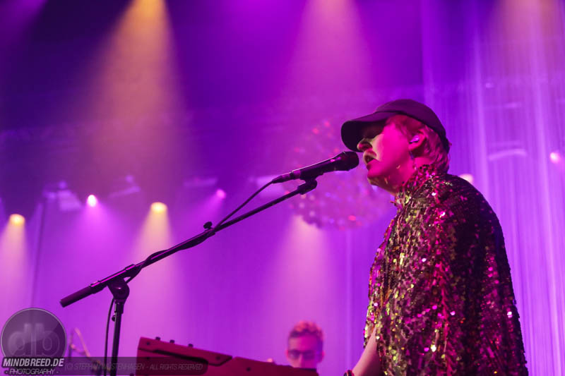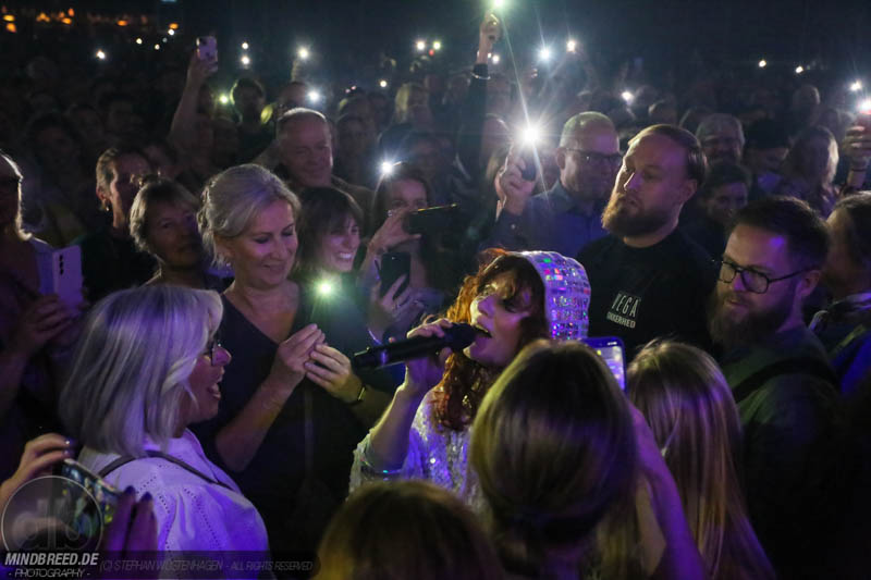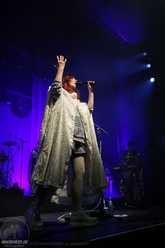 Nach einer entspannten Umbaupause kam gegen 21:00 Annika Aakjær quer durch das Publikum auf die Bühne. Die komplette Band war in paillettenbesetzte Capes gehüllt und betrat ruhig die Bühne, während eine tiefe Stimme eine selbstironische Ansage machte. Das Konzert begann magisch mit hunderten von Handylichtern und der erste Song hieß passend Gode nyheder (=Gute Nachrichten). Direkt darauf folgte das Poplied John Travolta. Kontroversiell weiter mit dem Titel Idiot. Hier schrieb die Sängerin ein Lied als Antwort auf einen männlichen, dänischen Songwriter. Er beschrieb einen Mann, der durch Charme alle Fehler bei seiner Freundin vergeben bekommt und dadurch immer wieder eine neue Chance bekommt. Annika besingt die Gegenseite. Eine Frau die sich immer wieder verarscht fühlt und dem guten Herren doch eher einen Laufpass erteilen sollte. Musikalisch gab es bereits in den ersten Songs eine krasse Mischung aus Rock, Pop und Indie. Sehr, sehr spannend und für alle was dabei. Gegen Mitte des Konzerts gab es dann auch ihren größten Hit: Pop. Mit fast 9 Millionen Streams auf Spotify steht der Song unangefochten an der Spitze ihrer Playlist. Das Lied macht einfach nur gute Laune und motiviert einfach mal feiern zu gehen und weckt tolle Sommererinnerungen. Etwas ruhiger ging es dann weiter mit Skulder ved skulder (=Schulter an Schulter bzw. besser Seite an Seite). Dieses Liebeshymne zeigte auch dem letzten im Saal, dass niemand alleine durchs Leben gehen muss. Darauf folgte dann noch eine Liebeshymne und zwar an ihre Wahlheimat: København – Copenhagen. Hier erkannte ich viele Dinge wieder, denn in den letzten Monaten war ich auch oft in Kopenhagen und habe mich mehr und mehr in die diese Hauptstadt verliebt. Zwischendurch gab es immer wieder spannende Erklärungen, Geschichten und Lebenstipps der Sängerin. Teilweise schien mir das schon fast zu langatmig (wer kennt es nicht von Die Ärzte-Konzerten), das Publikum war jedoch deutlich von den Hintergrundinfos angetan. Gegen Ende wurde es dann etwas ruhiger und es glich beinahe einem Akustikkonzert. Das reguläre Set wurde dann von Undskyld (Entschuldigung) abgeschlossen. Dann noch eine schnelle Zugabe bevor es für alle hieß Gute Nacht.