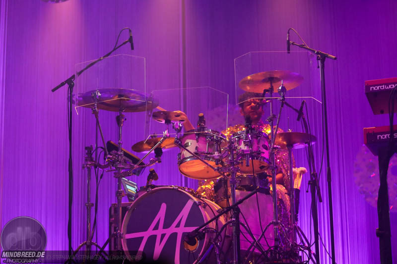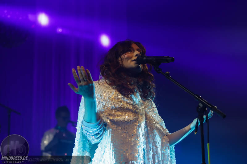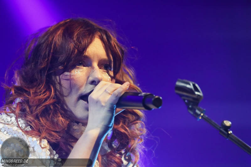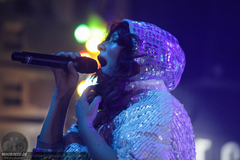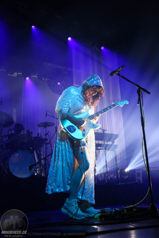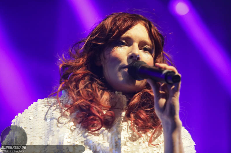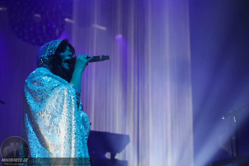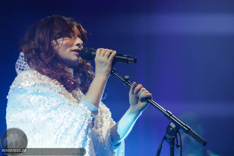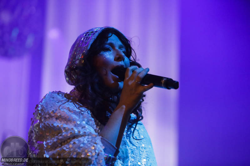 Nach einer entspannten Umbaupause kam gegen 21:00 Annika Aakjær quer durch das Publikum auf die Bühne. Die komplette Band war in paillettenbesetzte Capes gehüllt und betrat ruhig die Bühne, während eine tiefe Stimme eine selbstironische Ansage machte. Das Konzert begann magisch mit hunderten von Handylichtern und der erste Song hieß passend Gode nyheder (=Gute Nachrichten). Direkt darauf folgte das Poplied John Travolta. Kontroversiell weiter mit dem Titel Idiot. Hier schrieb die Sängerin ein Lied als Antwort auf einen männlichen, dänischen Songwriter. Er beschrieb einen Mann, der durch Charme alle Fehler bei seiner Freundin vergeben bekommt und dadurch immer wieder eine neue Chance bekommt. Annika besingt die Gegenseite. Eine Frau die sich immer wieder verarscht fühlt und dem guten Herren doch eher einen Laufpass erteilen sollte. Musikalisch gab es bereits in den ersten Songs eine krasse Mischung aus Rock, Pop und Indie. Sehr, sehr spannend und für alle was dabei. Gegen Mitte des Konzerts gab es dann auch ihren größten Hit: Pop. Mit fast 9 Millionen Streams auf Spotify steht der Song unangefochten an der Spitze ihrer Playlist. Das Lied macht einfach nur gute Laune und motiviert einfach mal feiern zu gehen und weckt tolle Sommererinnerungen. Etwas ruhiger ging es dann weiter mit Skulder ved skulder (=Schulter an Schulter bzw. besser Seite an Seite). Dieses Liebeshymne zeigte auch dem letzten im Saal, dass niemand alleine durchs Leben gehen muss. Darauf folgte dann noch eine Liebeshymne und zwar an ihre Wahlheimat: København – Copenhagen. Hier erkannte ich viele Dinge wieder, denn in den letzten Monaten war ich auch oft in Kopenhagen und habe mich mehr und mehr in die diese Hauptstadt verliebt. Zwischendurch gab es immer wieder spannende Erklärungen, Geschichten und Lebenstipps der Sängerin. Teilweise schien mir das schon fast zu langatmig (wer kennt es nicht von Die Ärzte-Konzerten), das Publikum war jedoch deutlich von den Hintergrundinfos angetan. Gegen Ende wurde es dann etwas ruhiger und es glich beinahe einem Akustikkonzert. Das reguläre Set wurde dann von Undskyld (Entschuldigung) abgeschlossen. Dann noch eine schnelle Zugabe bevor es für alle hieß Gute Nacht.