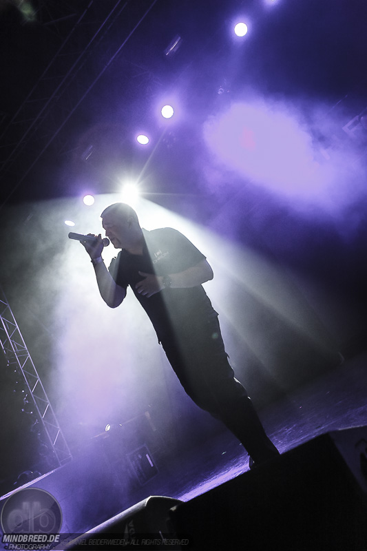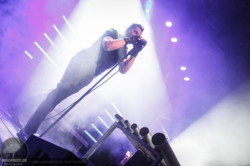 ROTERSANDSwitch zur 2nd Stage und gemütliches Eintrudeln zu Rotersand „Merging Oceans“. Nach dem extremen Spaß bei Hocico gerade find ich etwas ruhiger gerade sehr angenehm. Die dezente Lichtshow lenkt nicht ab, Sänger Rascal Nikov wirkt auch so auf der Bühne. Ein Hühne wie er ist schlecht zu übersehen. Rotersand nimmt sein Publikum mit, holt es immer wieder ins Boot und animiert zu tanzen. „Wer von euch ist denn schon richtig gerne hier“.
