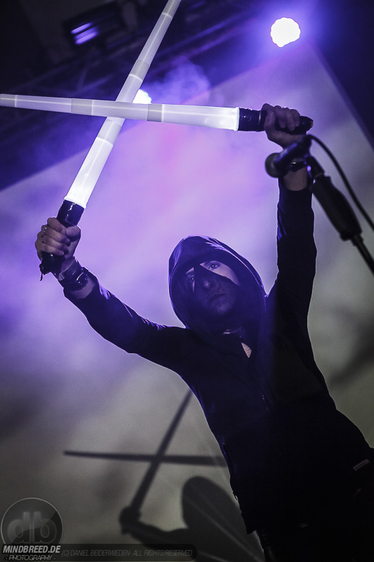Aber es wird weiter voller und nach und nach kommt Fahrt in die Sache, hier ein kleiner Mosh-Pit, da eine hochgeraffte Deutschlandfahne. Suicide Commando klären mich klangvoll auf das alle 40 Sekunden ein Selbstmord passiert. Gespielt haben sie gut ne Stunde, macht 90 Tote – so für die Statistik. Die Technik, die kurzzeitig einen Hänger hatte hat es aber kurzer Dank nicht dahingerafft und zu „Dein Herz, meine Gier“ war dann alles auf 100 %, Band als auch Publikum.