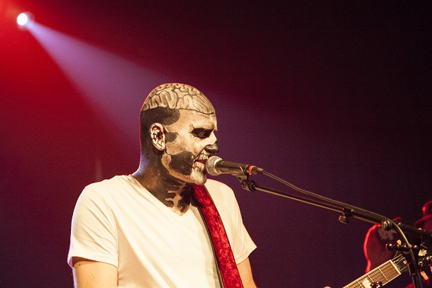 Eine qualvolle Viertelstunde halten Sondaschule das Publikum hin, spielen verschiedene Songs an, um dann doch noch nicht auf der Bühne zu erscheinen. Aber kurz bevor die Stimmung kippen kann, öffnet sich der Vorgang und Costa und Co schmettern den jubelnden Besuchern ihre schöne „Neue Welt“ entgegen. Vom Farbkonzept dominieren bei der Band, die stets Wert auf ein stimmiges Erscheinungsbild legt, an diesem Abend die Farben Schwarz und Weiß. Anlässlich der Karnevalsthematik haben sie sich sogar die Gesichter kälken und finstere Totenkopf- oder Clownsgesichter aufmalen lassen.