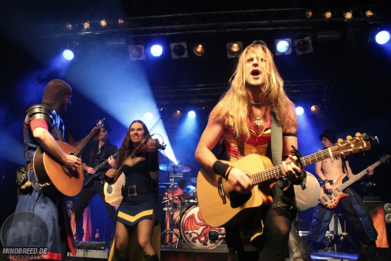 Den Hauptmann und seine Recken, die unter dem Namen Feuerschwanz seit mehr als einer Dekade durch die Landen touren, kennt wohl jeder Mittelalterrock Fan. Mit ihrer Mischung aus mittelalterlichen Klängen und humorvollen Texten hat sich der Haufen eine treue Fangemeinde erspielt. Nun war es an der Zeit die letzte CD „Auf’s Leben“ live zu zelebrieren.