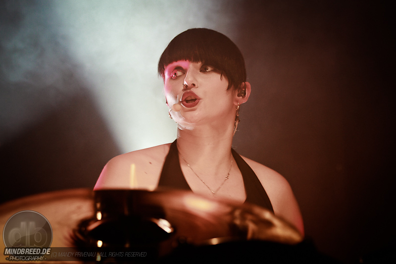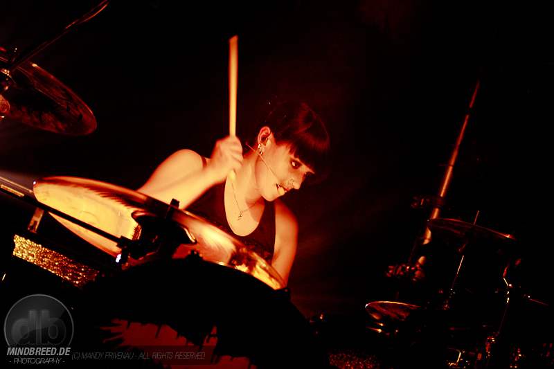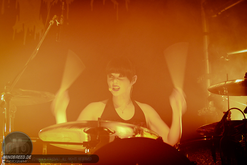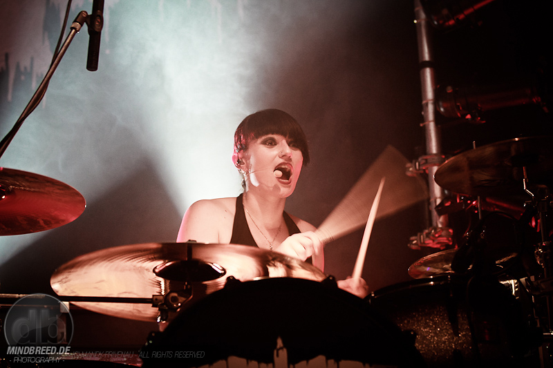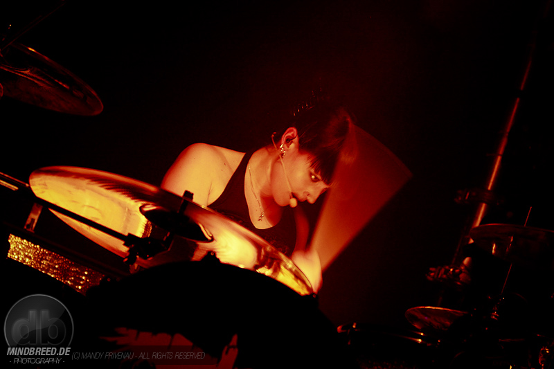 Danach folgt „Gothic Queen“ eine schöne Tanz Nummer aber das Publikum bewegt sich sowieso die ganze Zeit. Bei „A Love that never dies“ wird erst mal getrommelt und nicht nur Katha auch Carl und Manu trommeln mit. Die beiden Musiker vorerst hinter Vorhängen so das man nur ihre Schatten sieht was eine tolle Wirkung hat. Als dann mit einem weiteren Knall die Vorhänge fallen stehen beide mit ihren Saiteninstrumenten da und geben den Song noch mehr Power. Dann „Comedown“ und als mitsinge Nummer „Viva Hades“ Martin ruft ins Publikum „Dresden ich kann euch nicht hören“ und Dresden gibt sich mühe und will gehört werden.
