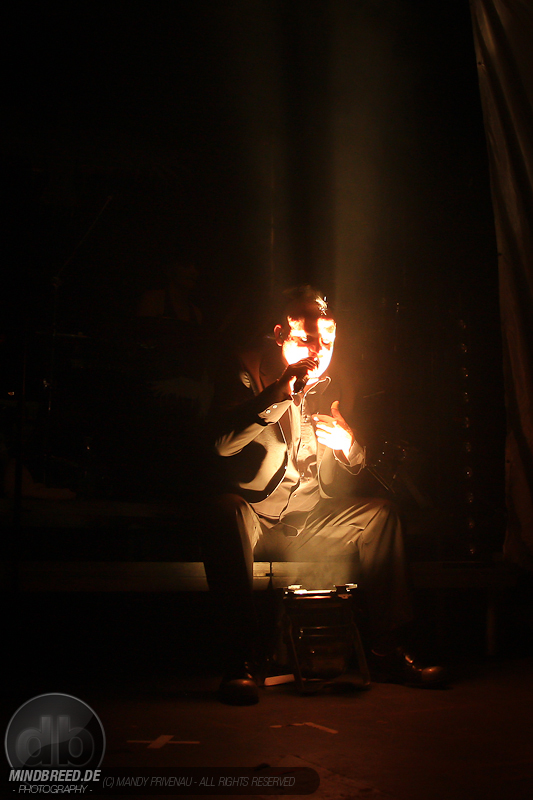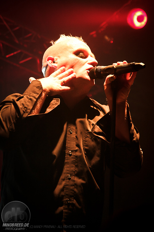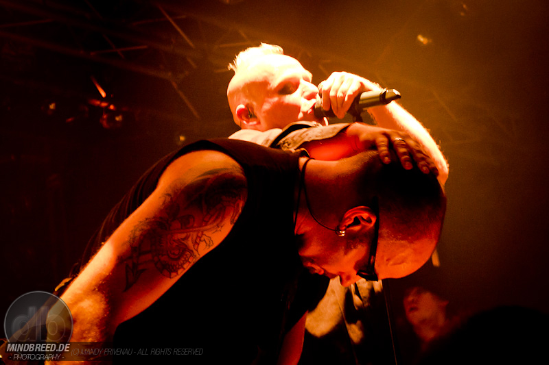 Doch zuerst kommen Stahlmann und heizen dem Publikum gehörig ein. Bei Songs wie „Willkommen“ und „Marschieren“ springt der Funke sofort über. Die vier Göttinger Jungs sind in der Neuen Deutschen Härte zu Hause und klingen zeitweise wie Eisbrecher und Unheilig. Auch sie tragen dunkle Anzüge und ihre Gesichter sind passend zum Namen silbern Geschminkt. Der Auforderung zum Mitklatschen kommen alle gerne nach und der Saal beginnt zu kochen. Stücke wie „Stahlmann“, „Kaltes Herz“ und „Hass mich… lieb mich“ folgen.
