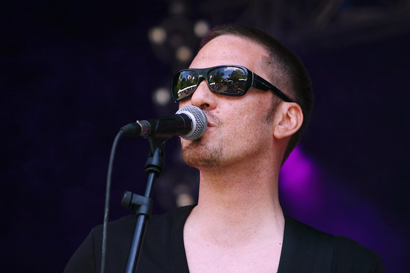 Weiter ging es mit SOLAR FAKE auf der kleinen Bühne, fast ein Heimspiel für Sven Friedrich, der aus der Nähe des Festivalspielortes stammt. Nahezu niemand kommt an diesem Namen vorbei, wenn man sich in der Szene bewegt. Ob Dreadful Shadows, Zeraphine oder eben Solar Fake – jeder findet in Svens Projekten etwas Passendes für sich. Das letzte Solar Fake Album ist zwar schon aus 2008, dennoch kommt hier keine Langeweile auf. Bereits mit dem ersten Beat zu „The Shield“ hatten Sven und Frank (Keyboards) das Publikum bereits voll in ihren Bann genommen.