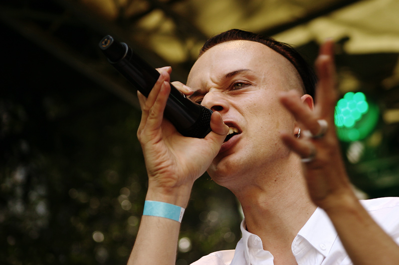 Auf der großen Bühne machten sich SLAVE REPUBLIC bereit. Das Duo versuchte wirklich alles um beim Publikum zu landen, aber entweder waren alle noch zu müde oder die richtigen Fans waren nur spärlich vorhanden. Denn mehr als ein wenig Fuss- oder Kopfnicken war dem Partyvolk nicht zu entlocken. Obwohl die Songs von Slave Republic sich gerade durch ihre Tanzbarkeit auszeichnen. Damals noch zu viert konnten aber auch die 2 verbleibenden Mitglieder Alec Fu (Gitarre, Gesang) und Alex Alice (Bass, Drumcomputer) die Songs in ein stimmiges Set verwandeln.
