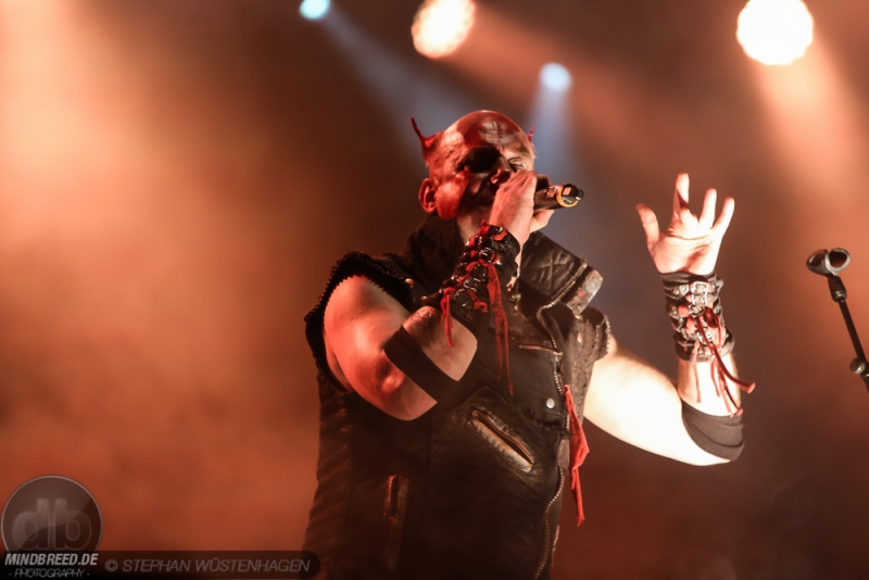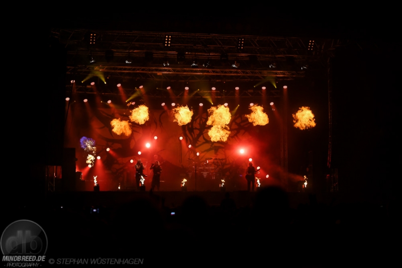Danach hatten dann Subway To Sally ihren großen Auftritt. Die Band hatte ich nun schon einige Male gesehen und irgendwie schien ich den Wechsel der Geigerin verpasst zu haben. Wo ist Frau Schmidt? Tja, die Frage blieb für mich unbeantwortet. Natürlich gab es beliebte Klassiker wie „Henkersbraut“ und auch das romantische Lied „Kleid aus Rosen“. Bei diesem Song sang das komplette Publikum mit und durfte sogar lautstark ohne Band den Refrain zum Besten geben. Sehr nett fand ich Eric Fishs Lob an die das Durchhaltevermögen der Rockharzveranstalter. Auch ich erinnere mich gerne an mein erstes Rockharz, auf dem auch Subway To Sally spielten. Damals in Osterode gab es quasi eine Regengarantie. Beim aktuellen Konzert folgten „Hallelujah“ und „Sieben“. Bei diesen Songs durften natürlich der gemeinsame „Schrei“ von Frontmann und Publikum nicht fehlen. Gegen Ende kam „Veitstanz“ und als die Songzeilen „Taumelnd stürz ich ins Verderben…“ erklangen tanzte sich auch das Publikum in Ekstase.