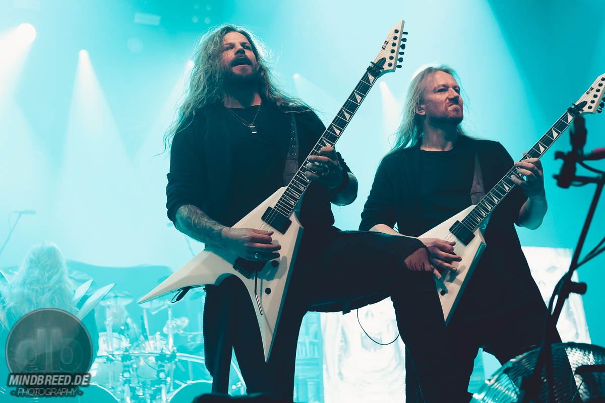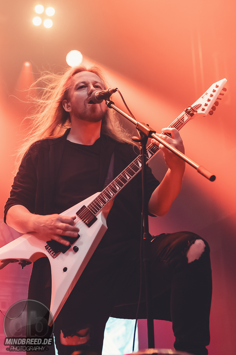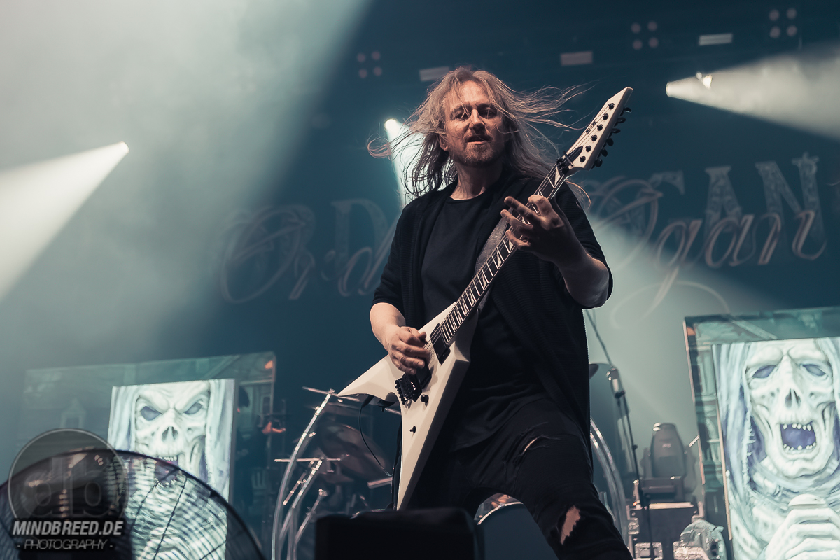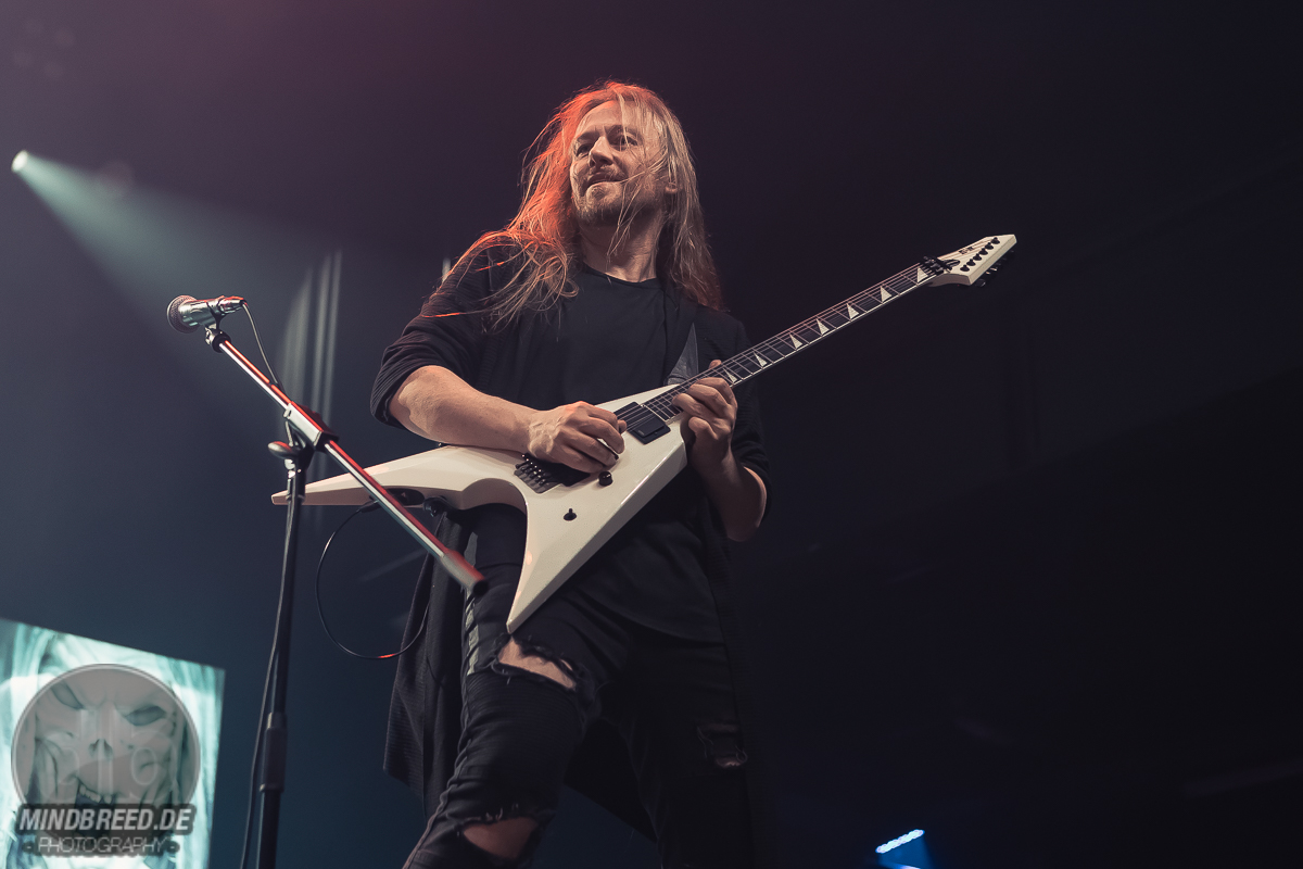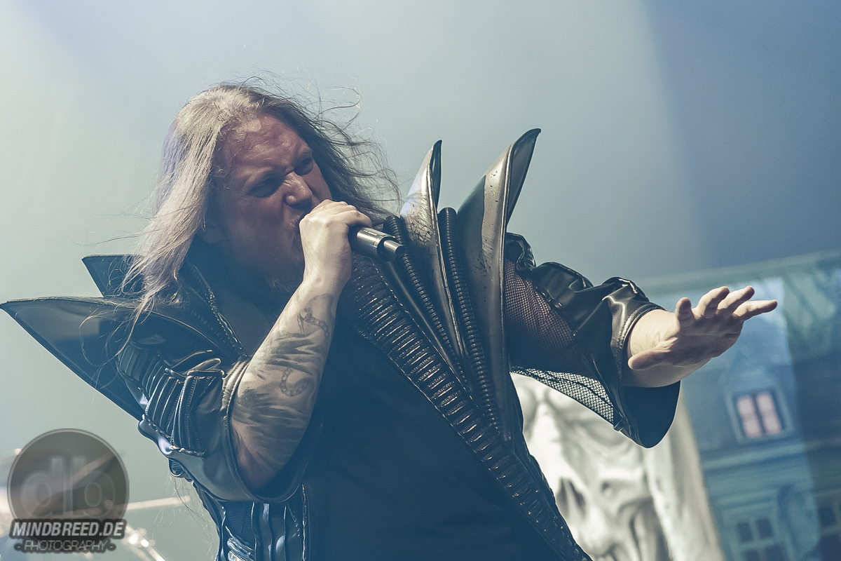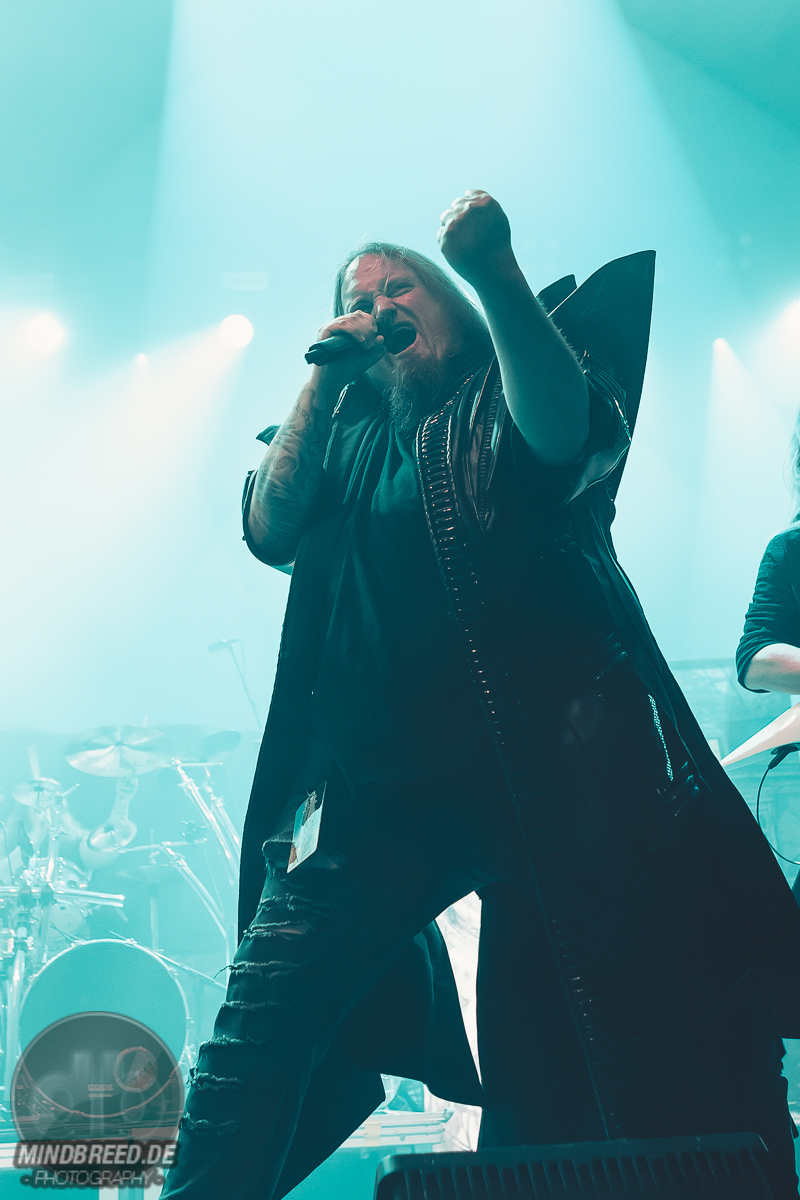 Nach einer kurzen Umbaupause ging es um 20:00 Uhr weiter und die Power-Metaller Orden Ogan legten zu „Heart of the Android“ los. „Guten Abend, Köln“ grüßte Seeb Levermann das Publikum, das ihm jubelnd antwortet. Allerdings nicht in Seebs Sinne. Ein bisschen Ordnung musste sein und die korrekte Antwort lautete natürlich „Guten Abend, Orden Ogan“. Nach einer kurzen Übungsrunde klappte das auch hervorragend, so dass es im Set weitergehen konnte. U.a. mit „F.E.V.E.R.“ und „Forlorn and Forsaken“. Die bereits von der vorherigen Band wach gemachten Fans waren auch bei Orden Ogan mit voller Stimmgewalt dabei. Teilweise sogar die Empore. Die Mannen um Seeb mussten kaum etwas machen, um die Stimmung hoch zu halten, legten sich aber dennoch ordentlich ins Zeug. Die jahrzehntelange Bühnenerfahrung hatte sie schließlich gelehrt, wie man die Fans bei Laune hält. Orden Ogan dürften aber auch gerade auf einer Glückseligkeitswelle schwimmen, schließlich kommt im Sommer ihr neuestes Werk „The Order of Fear“ auf den Markt. Den entsprechenden Titelsong des Albums gab es auf dieser Tour und demnach auch in Köln zu hören. Mit geforderter Publikumsunterstützung. Aber nicht, ohne dies vorher zu üben. Die Aufgabe war denkbar einfach. Es war einfach nur zu gegebener Zeit „Fear“ zu rufen. Theoretisch klappte das auch ganz gut. Also das Rufen auf Kommando. Allerdings meinte Seeb doch eher „Beer“ statt „Fear“ verstanden zu haben, was in Köln ja auch durchaus Sinn machen würde. Da das prompt auch dem Publikum eher lag, wurde „The Order of Fear“ eben in „The Order of Beer“ umgewandelt. Dieses System kam auch am Ende des knapp 50-minütigen Sets zum Einsatz: als letzten Song gab es „The Things We Believe in“. Auch hier gab es eine Aufgabe für das Publikum, nämlich die Unterstützung bei „Cold, Dead and Gone“. Seeb erinnerte sich aber an die „Fear – Beer“ Sache und versuchte es daher mit den Varianten „Cold, Dead and Beer“, „Cold, Beer and Beer“ und „Beer, Beer and Beer“. Es wunderte wohl niemanden, dass die letzte Variante das Palladium zum Erbeben brachte und dass auch der letzte Song daher spontan umgetextet wurde. Übrigens: wer bei Orden Ogan headbangen möchte, aber nicht über die entsprechende Haarpracht verfügt, der darf einfach seine Hände zu Hilfe nehmen.