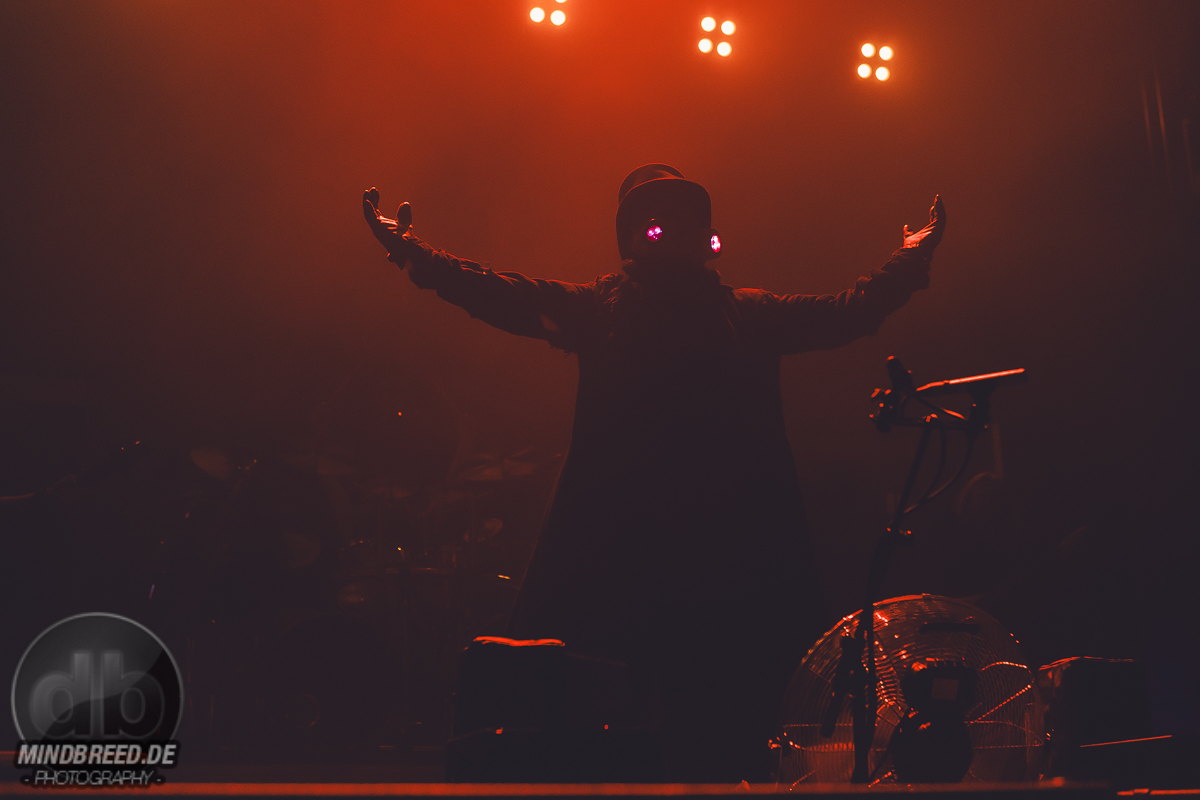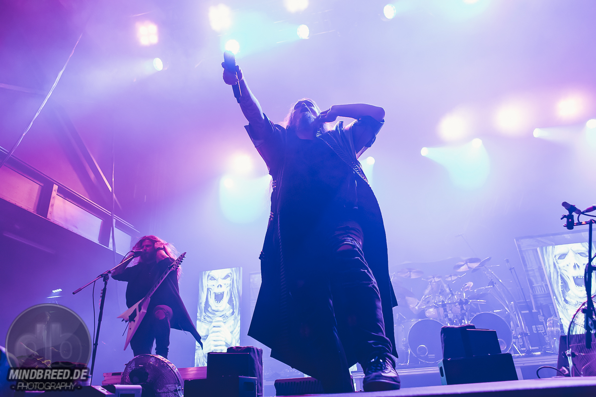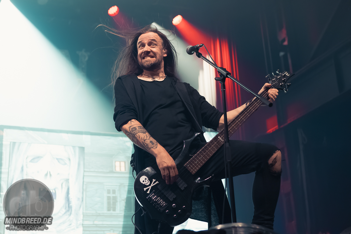 Um 19 Uhr schließlich wurde das Licht gelöscht und zu den Klängen des „Time Warps“ konnte man sich auf das vorbereiten, was nun folgen würde: die Zombies von Dominum enterten die Bühne. Es handelte sich bei ihnen aber nicht um diese typischen langsamen, trägen Zombies. Eher um diese schnelle und damit noch gefährlichere Spezies. Zum Glück wurden sie von Dr. Dead gebändigt. Mit ihrem potenziellen Futter spielten sie trotzdem und heizten dem Publikum immer wieder ein. Dr. Dead platzierte sich schützend die meiste Zeit im vorderen Teil der Bühne. Oder weiter anheizend, damit seine Zombies mehr Spass hatten? Man weiß es nicht. Aber was auch immer der Grund war: es wirkte. Dominum wurden gefeiert wie ein Headliner. Das merkte auch Dr. Dead und überlegte laut, ob man diesen Hexenkessel wohl noch weiter zum Brodeln bringen könnte (Spoiler: ja!). Dass Dr. Dead nicht nur seine Zombies, sondern auch das Futter kontrollieren konnte, bewies er regelmäßig. Z.B. als das Futter – also die Fans, ´tschuldigung – zu „Rock you like a Hurricane“ den „Here I am“-Part übernehmen sollte. Das klappte im unteren Bereich hervorragend. Auf der Empore so gar nicht. Was vielleicht daran lag, dass man da deutlich Zombie-sicherer stand und wohl nicht zu viel Aufmerksamkeit auf sich lenken wollte. Doch Dr. Dead bemerkte das natürlich und ließ die Fans im unteren Bereich denen auf der Empore zeigen, wie man das so macht. Offenbar war das eine Methode, um seinen Einflussbereich zu vergrößern, denn nun ließ auch das Publikum auf der Empore alles Sicherheitsgefühl fahren und wurde laut. Um diese Beeinflussung nicht zu verlieren, hielt Dr. Dead das Kommunikationsniveau hoch. Seine Frage, ob er aufhören solle zu reden und lieber weiter spielen soll, wurde zwar frecherweise mit einem lauten „Ja“ beantwortet. Aber schließlich hatte hier Dr. Dead das Sagen. Und nicht das Futter. Dominum spielten in ihrem Set dann doch weiter. Das 40-minütige endete, leider viel zu früh, mit „We All Taste the Same“ und „Patient Zero“. Dominum haben ihren Job als Support wahrlich ernst genommen. Das Publikum war ordentlich angeheizt, der Spaß-Level hoch. Das könnte aber auch durchaus Eigeninteresse gewesen sein, denn Dominum wollten auch noch zum Merch, wo man sie besuchen konnte. Also sich vorstellen … offenbar mag diese neue Zombie-Spezies ihr Futter vorher kennenlernen.