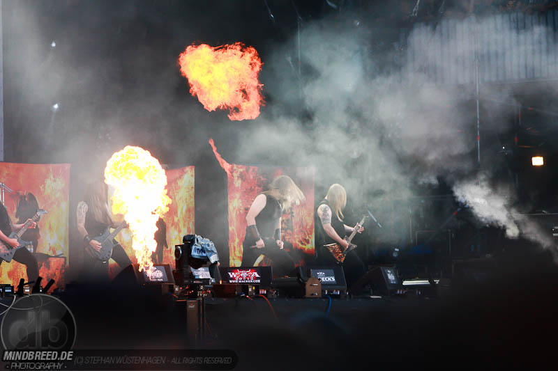 Gegen 19:00 hiess es noch mal alle Kräfte für den Endspurt motivieren. Amon Amarth sollten 20:00 auf der True Metal Stage spielen. Auch diese Band durfte ich vor ein paar Wochen auf dem Rockharz hören und fotografieren. Schon im Harz war ich mehr als begeistert. Johann genoss sichtlich die noch größeren Dimensionen in Wacken. Es gab ordentlich Pyro aber auch einfach mal fetten Vikingmetal auf die Ohren.