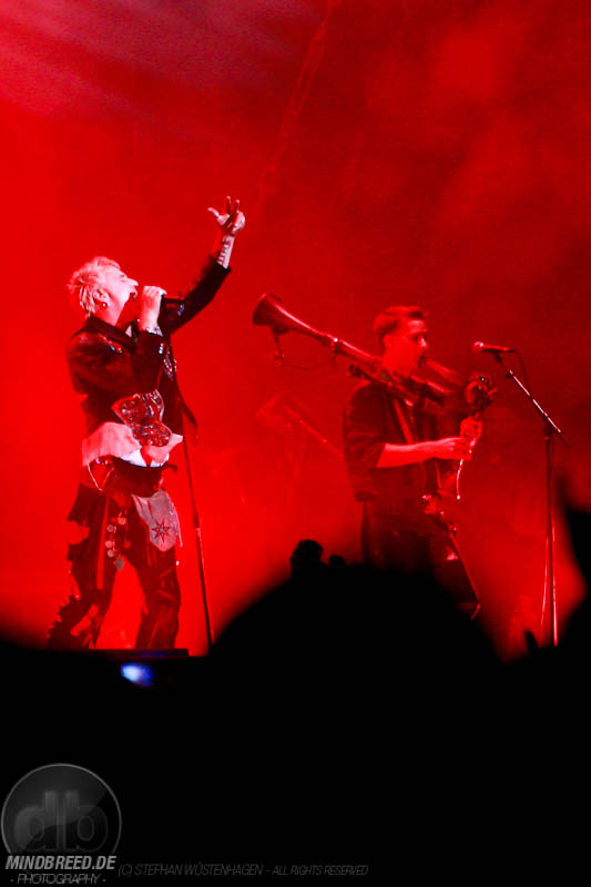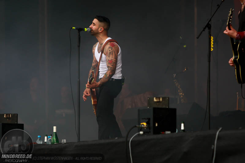 Die erste Band unseres verkürzten Lineups waren Die Broilers. Die Oi-Punkband, die sich mittlerweile mit ihrem letzten Santa Muerte einemdeutlich breiteren Publikum geöffnet haben, prösentierte sich in Bestform und nicht minder selbstironisch, dass sie auf solch düsteren Festival spielen dürfen. Unsere Redakteurin Nathalie, ihres Zeichens eher aus der Punksparte, war jedenfalls hell auf begeistert. Es kamen die üblichen Kracher „Ich bin bei dir“, „Meine Sache“ und „Paul…“ und mehrere tausend Kehlen schrien mit.