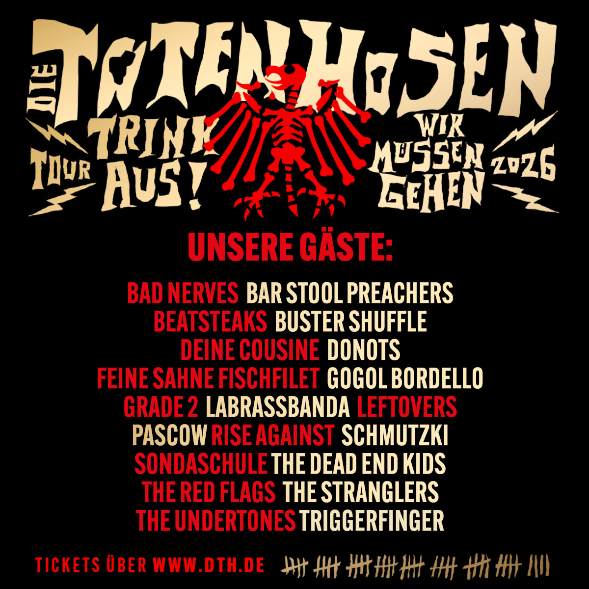 Die Toten Hosen kündigen ihre Gäste für die kommende „Trink Aus! Wir Müssen Gehen“ Tour an. Bisher haben sich schon 830.000 Fans Karten für die Tour 2026 gesichert. Für viele Städte gibt es jetzt nochmal ein paar Restkarten auf www.dth.de, aber auch die Option auf ein sogenanntes Sozialticket.