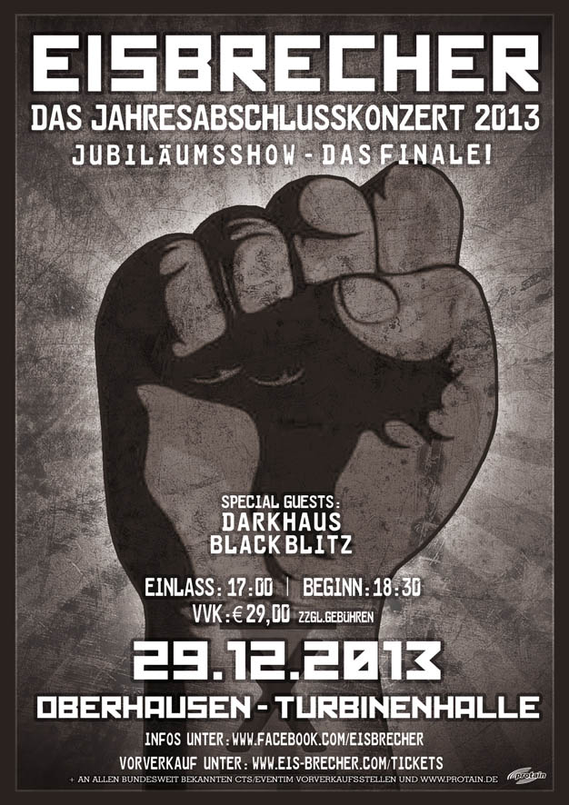 Nachdem in den letzten Jahren die Abschlusskonzerte in München und Stuttgart in ausverkauften Hallen gespielt wurden, geht es diesmal am 29. Dezember 2013 in die Turbinenhalle Oberhausen. Zusammen mit Darkhaus und Black Blitz heizen euch Eisbrecher dort kräftig ein.