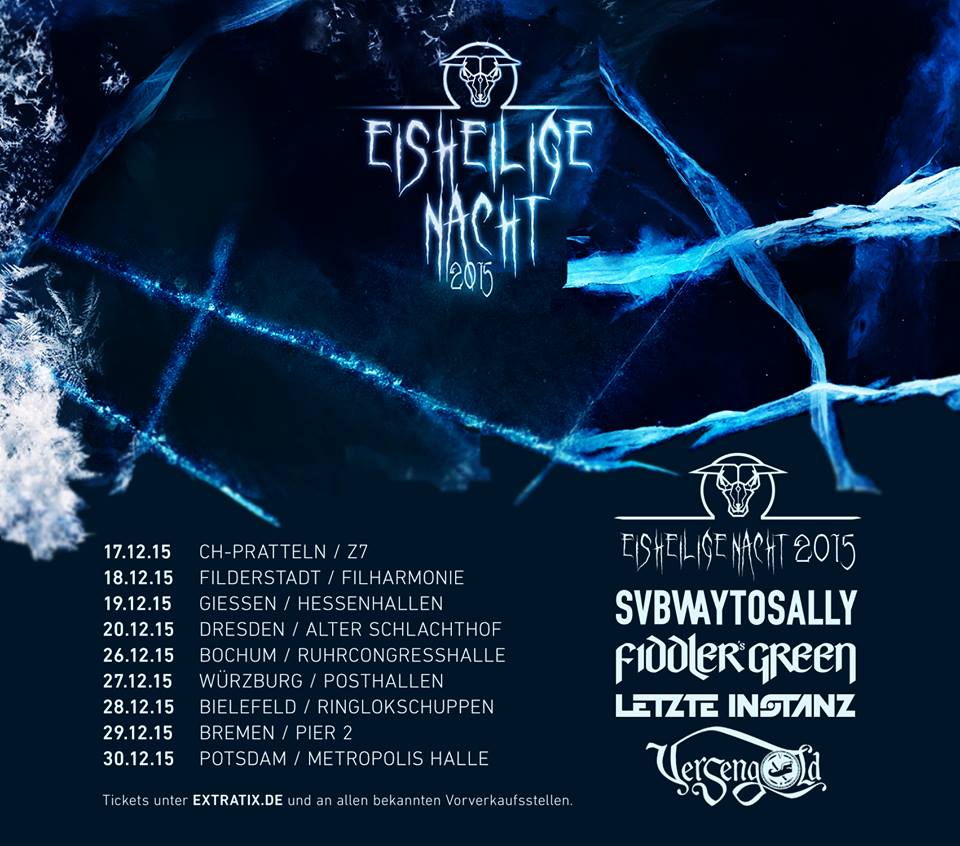 Auch in diesem Jahr gehen Subway to Sally mit ihrer Konzertreihe Eisheilige Nacht 2015 auf Tour. Mit dabei sind diesmal Fiddler’s Green, Letzte Instanz und Versengold, die Subway to Sally bei insgesamt neun Auftritten unterstützen werden.