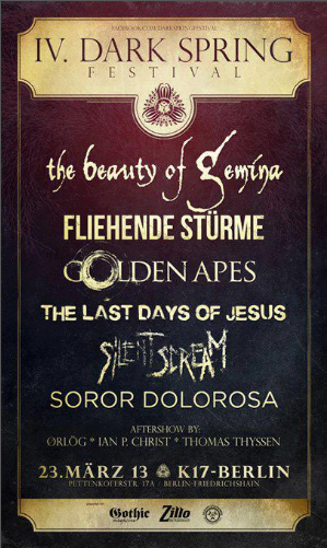 Mit dabei sind diesmal The Beauty Of Gemina, Fliehende Stürme, Golden Apes, The Last Days Of Jesus, Silent Scream und Soror Dolorosa.