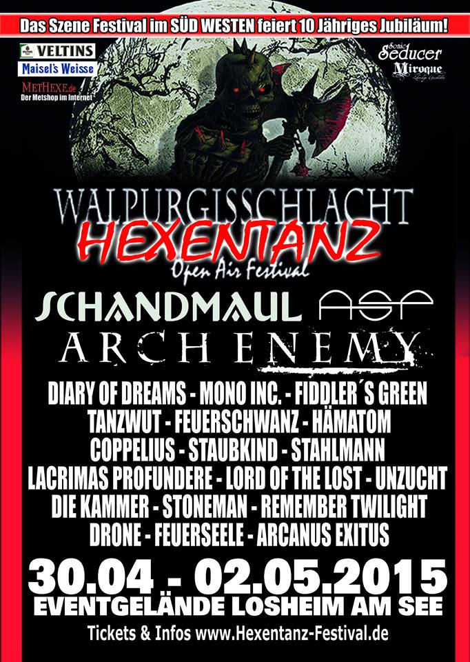 10 Jahre Hexentanz Festival – das muss gefeiert werden. Das dachten sich offenbar auch die Veranstalter, und haben uns für 2015 ein Lineup der Extraklasse beschert. Mit Schandmaul, ASP und Arch Enemy stehen drei großartige Headliner auf dem Programm, Szenegrößen wie Diary of Dreams, Mono Inc., Lord of the Lost und Unzucht sorgen für weitere Highlights.
