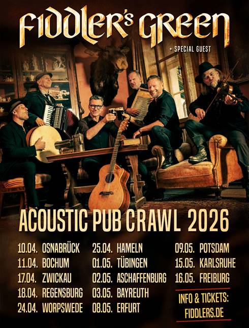 Fiddler’s Green hat eine Akustiktour zum 35. Jubiläum angekündigt. Die Band ist bekannt für ihren „Irish Speedfolk“. Die Acoustic Pub Crawl Tour 2026 wird vom 10. April bis Ende Mai 2026 in Deutschland stattfinden.