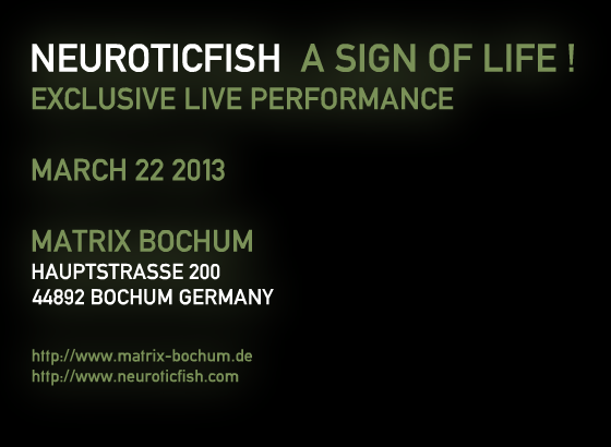 Im September 2012 berichteten wir von ersten Lebenszeichen des Projekts Neuroticfish – am 22. März findet ein exklusives Konzert in der Matrix Bochum statt, bevor Neuroticfish auf dem Resistanz Festival, dem Blackfield Festival und dem Nordstern Festival auftreten.