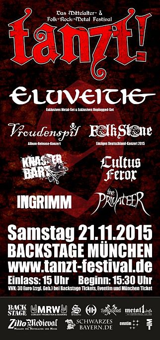 Die neunte Ausgabe des TANZT! am 21. November 2015 im Backstage Werk in München wird dank eines abwechslungsreichen und hochkarätigen Aufgebots an Bands nicht nur für Fans und Freunde des Mittelalter- & Folk-Rock/-Metals ein unvergessliches Erlebnis.