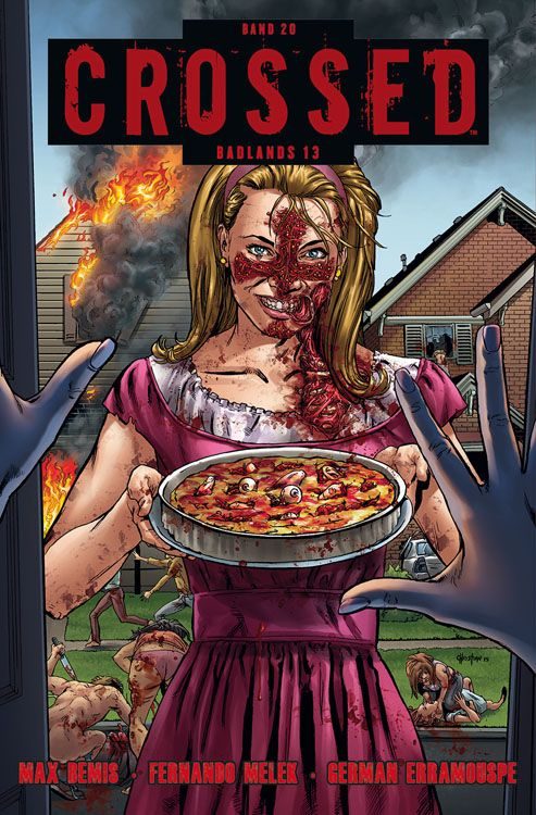 Mit dem neuen Comic Crossed Band 20 – Badlands 13 von Max Bemis, Fernando Melek und German Erramouspe erscheint ein Autorenbeitrag vom Sänger von Say Anything (Max Bemis) in der Crossed-Reihe. Das Cover grüßt makaber mit einer Gefirmten und einen Teller voller Körperteile und körpereigenen Flüssigkeiten in der Hand, ein wenig lächelnd und im Hintergrund ist die Apokalypse weiterhin – im wahrsten Sinne des Worten – am Lodern.